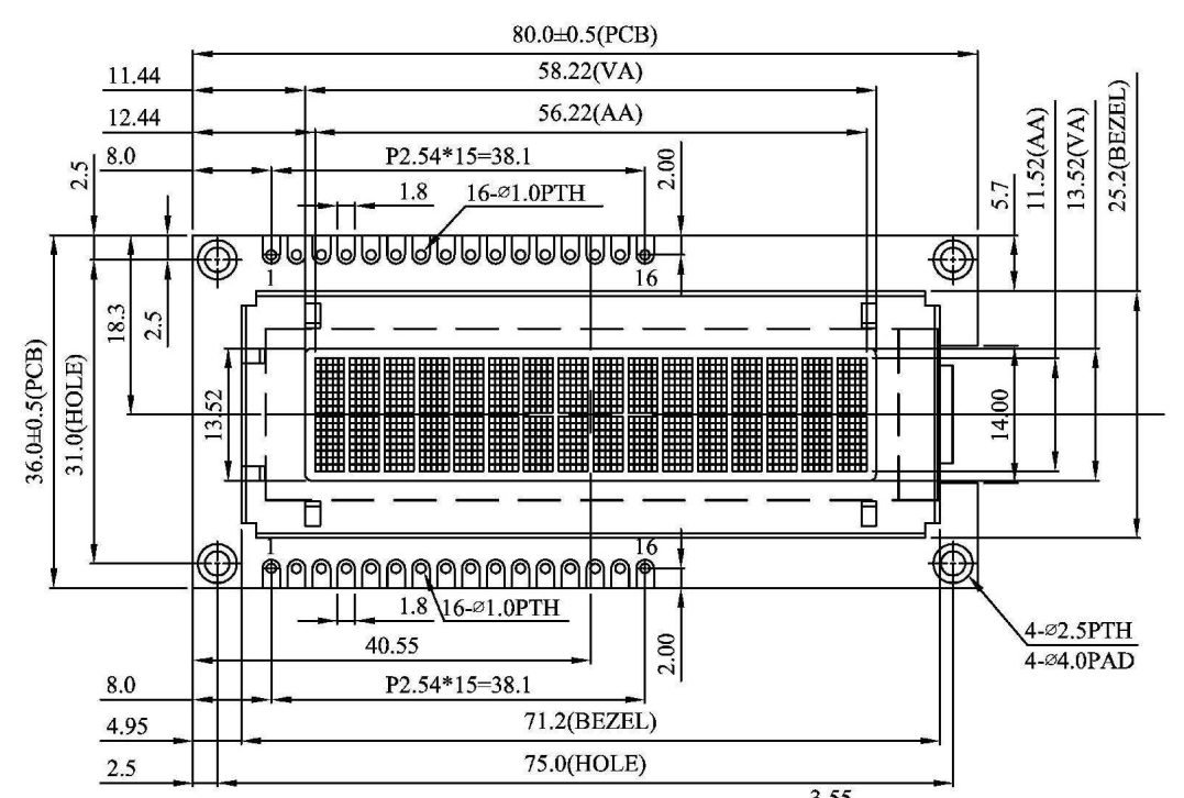 16x2 1602 COB OLED Character I2C Display Product Drawing